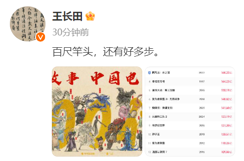 2月13日,《哪吒之魔童闹海》总票房突破百亿元。14日,光线传媒董事长王长田在微博发文回应:“百尺竿头,还有好多步。”