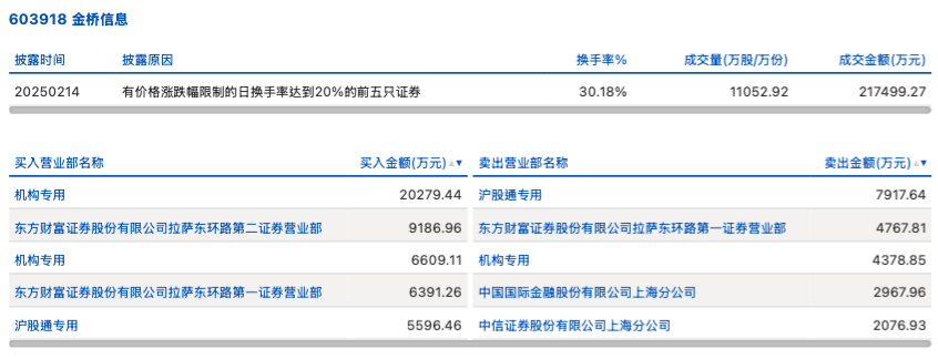 2月14日,金桥信息今日涨停,全天换手率达30.18%,振幅达14.69%。龙虎榜数据显示,营业部席位合计净买入2.6亿元。其中,机构买入2.69亿元,卖出4378.85万元,合计净买入2.25亿元。此外,东方财富证券拉萨东环路第二证券营业部、东方财富证券拉萨东环路第一证券营业部分别买入9186.96万元、6391.26万元;沪股通专用、东方财富证券拉萨东环路第一证券营业部分别卖出7917.64万元、4767.81万元。