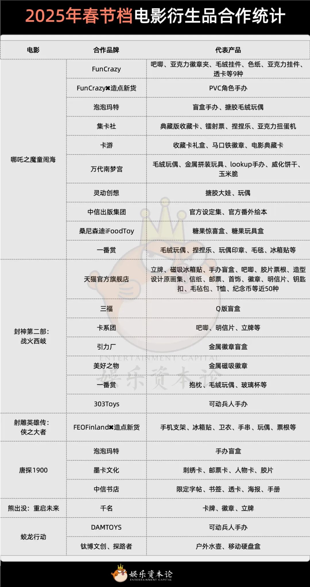 不仅是《哪吒之魔童闹海》,据娱乐资本论统计,这个春节档的6部电影,借助系列化IP优势,与至少20家品牌合作推出百余种衍生品,销售额累计上亿。