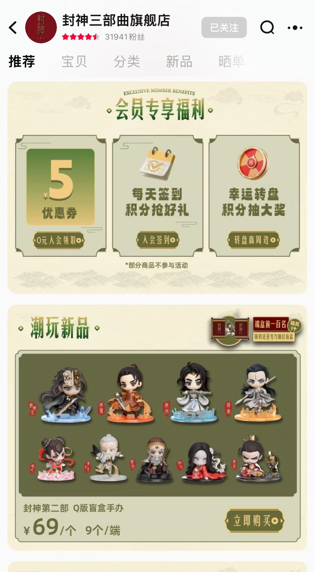IP衍生品通常由片方与第三方品牌进行合作,并在第三方渠道内进行销售,而封神三部曲天猫旗舰店的出现,预示着电影版权方对衍生品生产销售、IP长线运营和商业化价值的重视程度进一步提高,旗舰店提供了一个可以聚集起IP粉丝的集中场域,并通过用户的真实反馈实现有效互动,为用户带来深度而多元的体验。