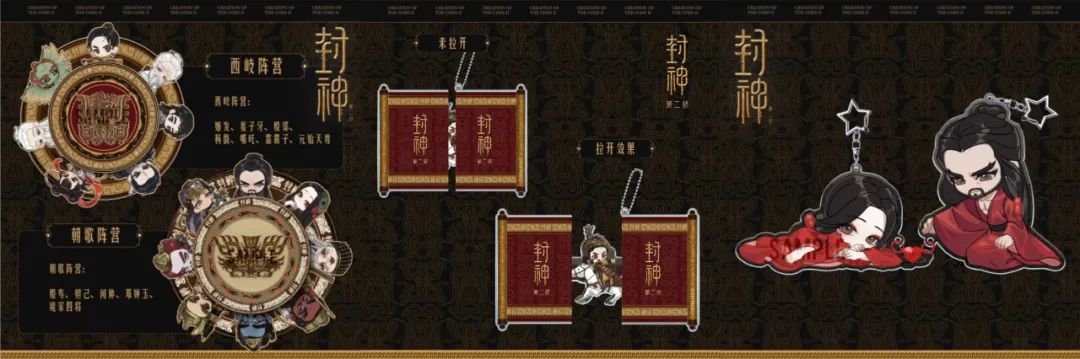 比如可以巧妙模拟开榜动作的抽拉挂件,以饕餮图腾、凤鸟图腾分别代表朝歌与西岐阵营的可旋转金属徽章,还有隐喻着情感纠葛关系的殷寿与妲己磁吸钥匙扣套组等。目前旗舰店中销量最高的是角色变装磁吸拆拆乐,用户可为角色换装,具有极强的互动性与趣味性。