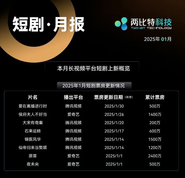两比特科技数据显示,在2025年1月上新的短剧中,腾讯视频独播10部、爱奇艺独播7部、优酷独播5部、芒果TV独播2部。其中,爱奇艺的《原罪》《侯府夫人不好当》《夜未央》的累计票房分别达到2400万、1400万、500万。