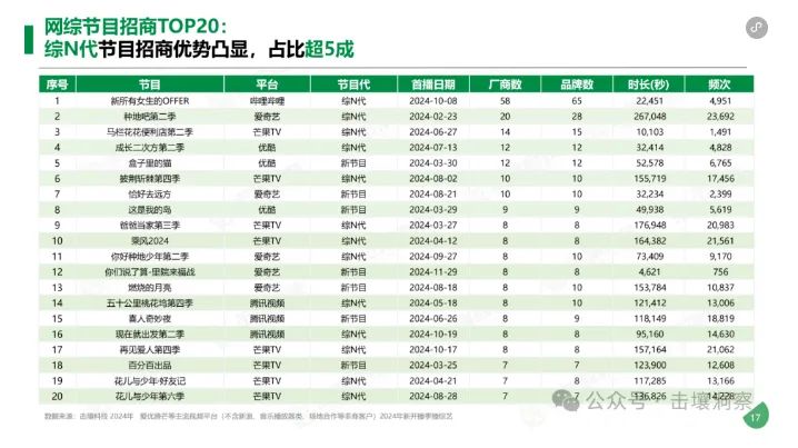 据击壤洞察数据,2023年,《乘风2023》《披荆斩棘第三季》分别以18个、16个招商品牌数拿下2023年网综招商TOP1、TOP2。但今年,高居榜单前两名的节目却变成了B站独播的《新所有女生的offer》和爱奇艺独播的《种地吧2》,而《乘风2024》《披荆斩棘第四季》分别掉到了第六位、第十位,同时招商品牌数也分别下滑到了10个、8个。