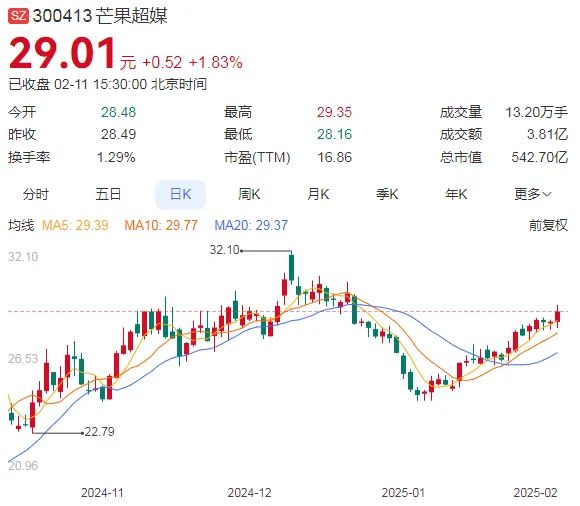 进入今年以来,芒果超媒的股价与总市值虽整体转入上升态势,但截至最近一个交易日,芒果超媒的最新股价对比在2021年创下的股价高点92.1元/股,缩水68.5%,总市值为542.70亿元。