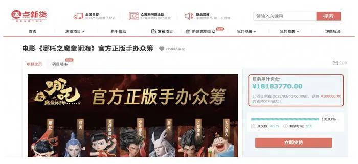 相比之下,此前国产电影常用的众筹式售卖周边就显得有些谨慎了。《哪吒2》的另一合作方FunCrazy塑料主义、阿里鱼旗下品牌“造点新货”,在上线后也于淘宝上发起了周边众筹项目。目标筹款10万元的众筹手办,最终以超过1800万元大幅度超额完成任务。