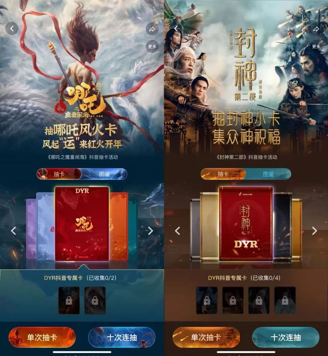 甚至在这批影片的互联网宣发中,我们都能看到“谷子经济”的超强渗透。在之前的文章(回顾:《影史最佳春节档,抖微红快营销分蛋糕》)中我们曾观察到,电子抽卡已经成为多个平台春节档营销的共同选项,有不少影片都通过电子收藏卡抽卡游戏来吸引观众加入互动传播。在特定的对口影片领域,这是ROI潜力巨大的宣发策略。