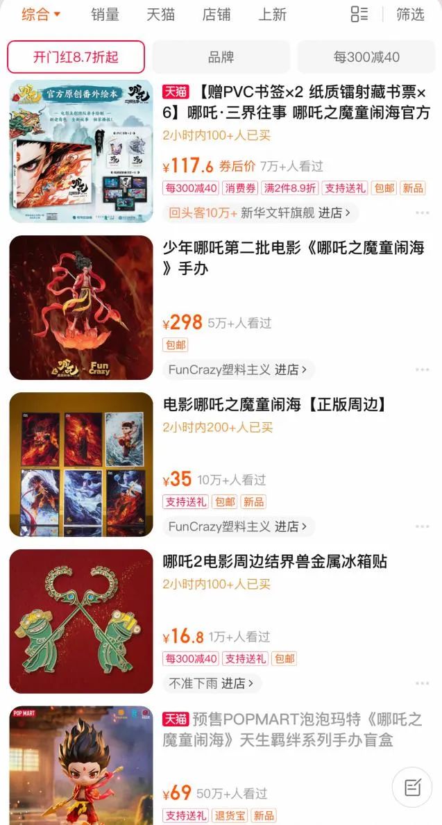 目前犀牛君在淘宝、哔哩哔哩会员购等平台上搜索《哪吒2》周边关键词,能够看到覆盖盲盒、卡牌、毛绒、手办、冰箱贴、徽章、托特包、贴纸等数十种官方正版授权周边均处于热销状态。