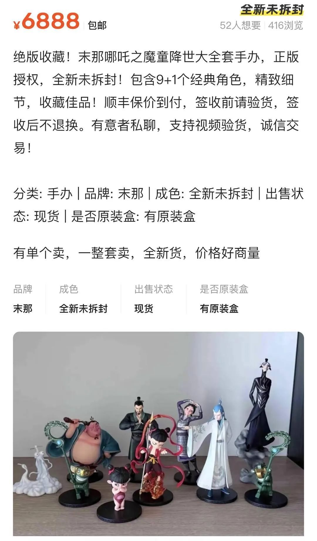 目前在淘宝上搜索关键词可以看到不少自制同人周边,质量参差不齐。而前作《哪吒1》的绝版周边更在闲鱼上炒出高价,据了解,万代《哪吒1》哪吒可动人偶目前涨价幅度亦接近600元,《哪吒1》全套正品手办原价1388元,最高涨到6888元。
