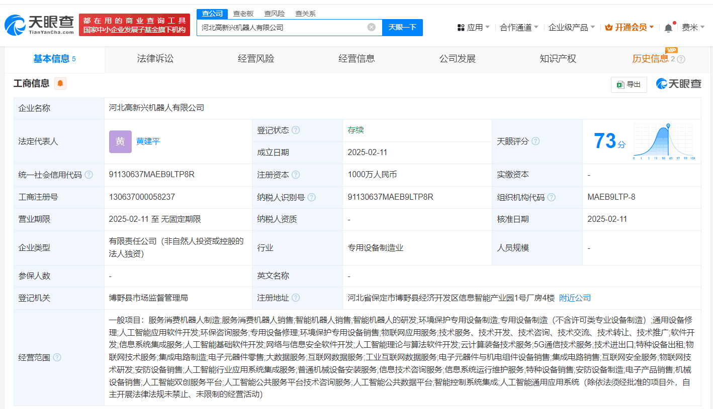 天眼查App显示,近日,河北高新兴机器人有限公司成立,法定代表人为黄建平,注册资本1000万人民币。