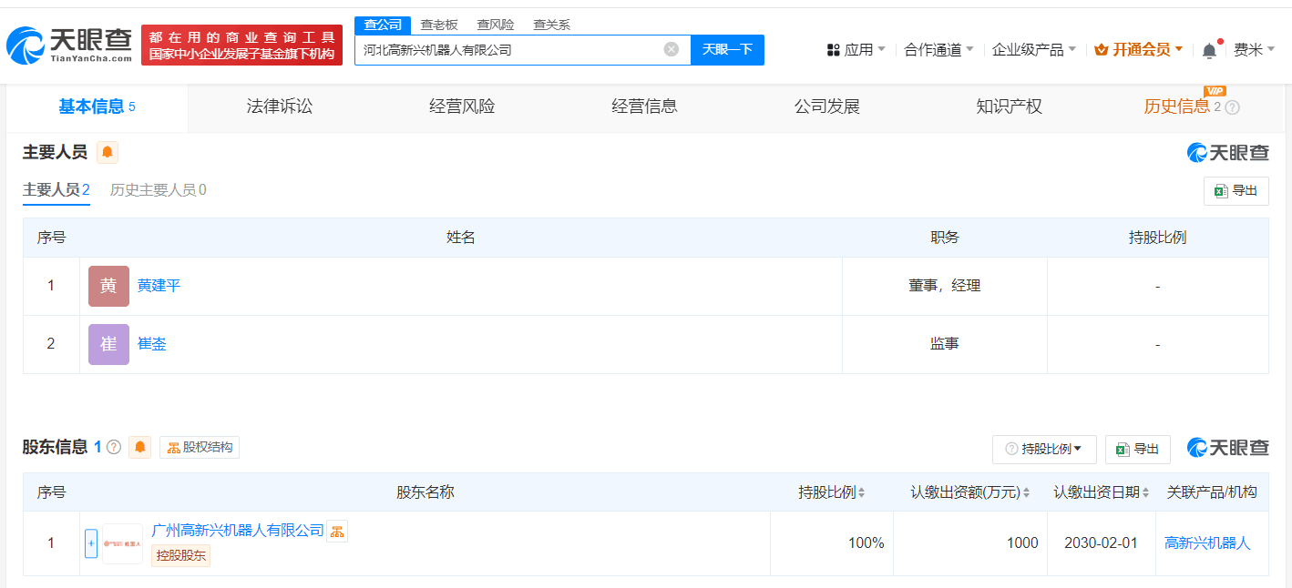 据每日经济新闻报道,天眼查App显示,近日,河北高新兴机器人有限公司成立,法定代表人为黄建平,注册资本1000万人民币,经营范围含服务消费机器人制造、服务消费机器人销售、智能机器人的研发、人工智能应用软件开发、人工智能基础软件开发、人工智能双创服务平台等,由广州高新兴机器人有限公司全资持股。