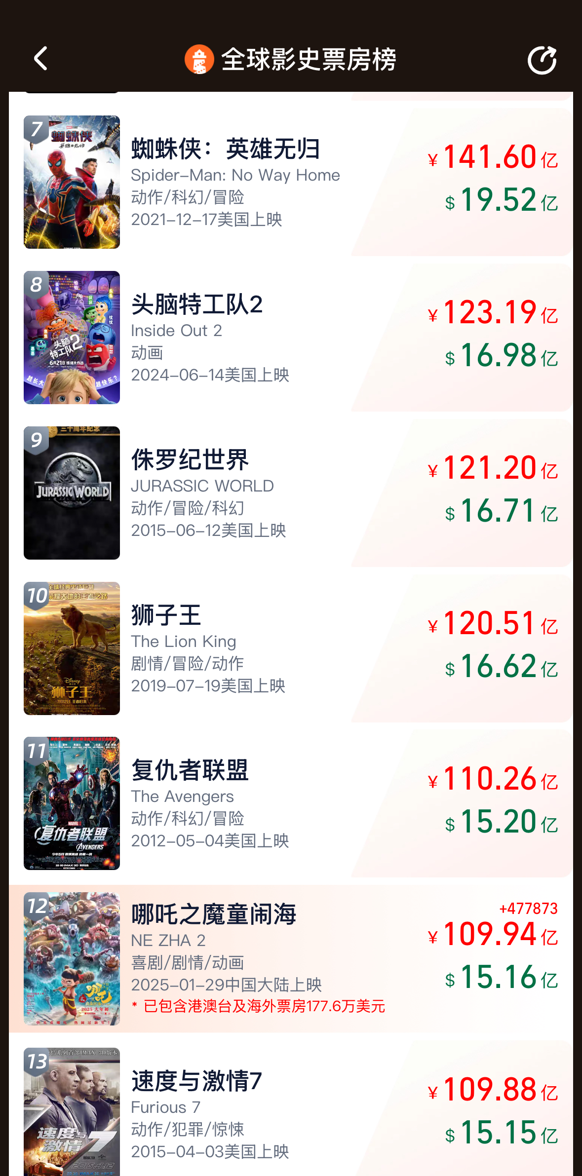 2月15日,据灯塔专业版数据,影片《哪吒之魔童闹海》全球票房(含预售)超越《速度与激情7》,进入全球影史票房榜前12名。