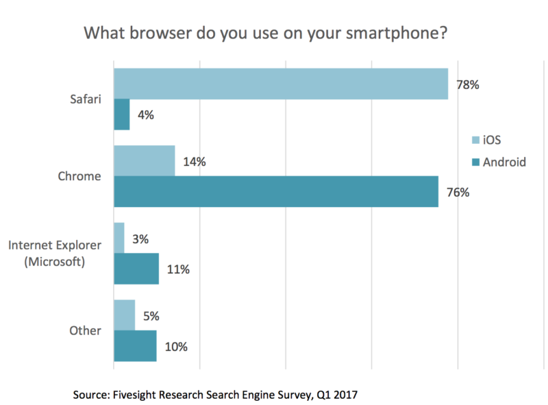 对于智能手机用户使用最多的浏览器调查中看到,苹果用户使用最多的是Safari,有78%的用户在使用。安卓用户使用最多的是Chrome,使用用户达76%。