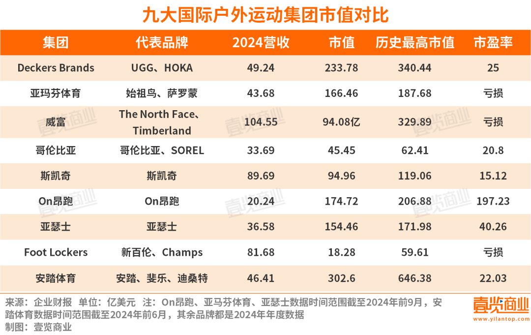 这为暴跌之日的到来埋下了伏笔。壹览商业统计目前国际上九大户外运动集团2024年营收、市值等指标发现,Deckers的历史市值高点仅次于安踏,在九大集团中位列第二,但过去一年的总营收不一定能排进前五。