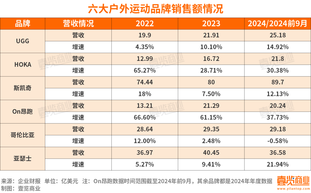 壹览商业选取了斯凯奇、On昂跑、哥伦比亚、亚瑟士四大品牌的近三年销量作为UGG、HOKA的对比项。这四大品牌均主打鞋履以及户外运动服饰、均是全球性知名品牌、均定位专业户外运动或运动休闲品牌。可以看到,HOKA的营收总额在三年内将近翻倍,已逼近On昂跑、哥伦比亚。