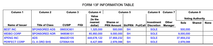2月17日早间,阿里巴巴在港交所公告,其向美国证券交易委员会(SEC)提交的13F文件显示,截至2024年第四季度末,其持仓总市值约为5.4亿美元。其中,阿里巴巴持有50万股百世集团ADS、900万股微博ADR、约3795.9万股小鹏汽车ADS。