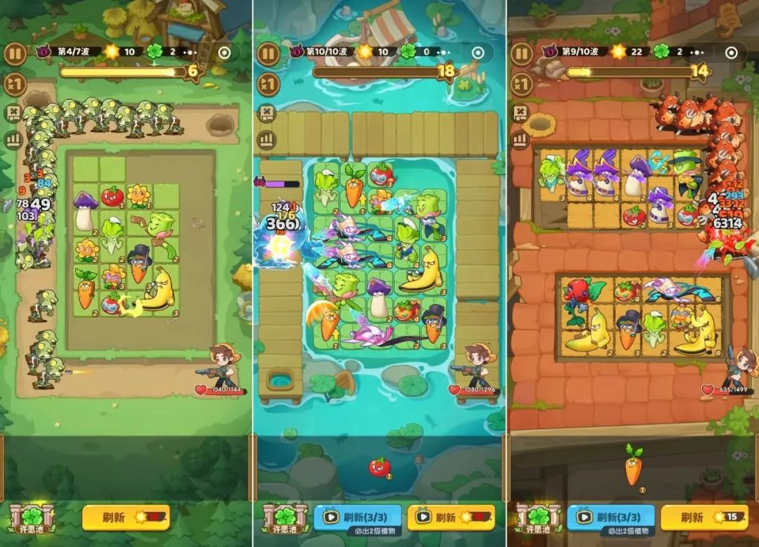 开始游戏后,玩家只需要将系统随机提供的植物英雄,放进有限的格子内,就能组成我方战力,抵挡不断前进的怪物,保护位于终点的主角。战斗过程中,玩家可以随时合成或移动植物,通过阵营调整提升输出效率。