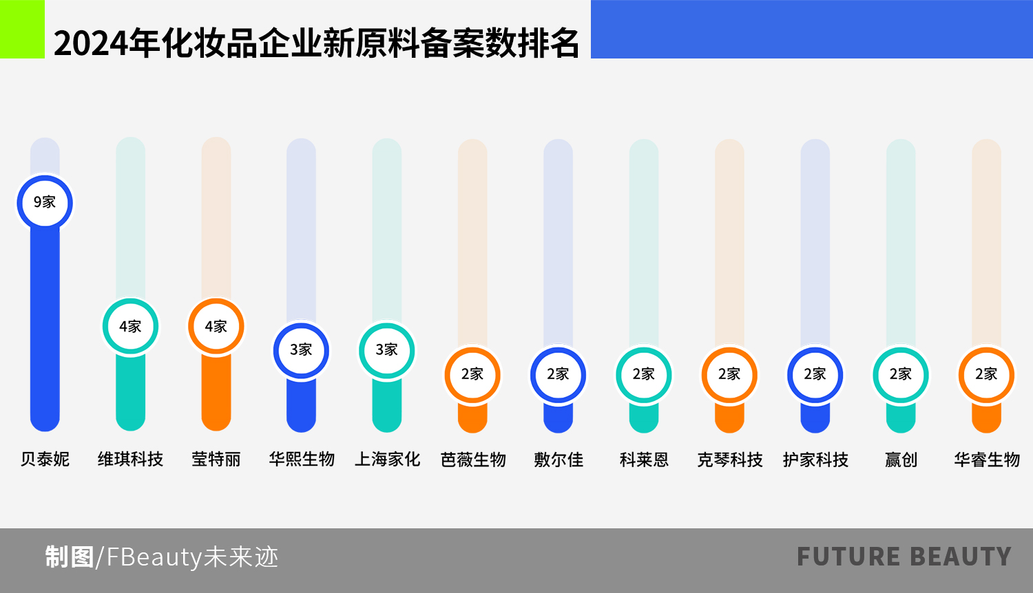 而在2024年的新原料备案数企业排名中,贝泰妮、维琪科技、华熙生物、上海家化等国货企业位居前列。这些企业可是说是伴随行业的发展,实现了从“国产替代”到“全球卡位”的蜕变。