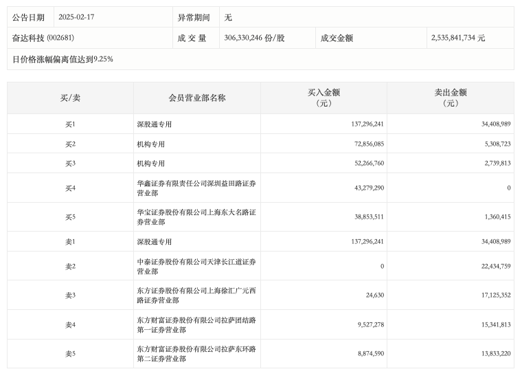 2月17日,奋达科技今日涨停,全天换手率达19.85%,振幅达9.53%。龙虎榜数据显示,营业部席位合计净买入2.5亿元。其中,机构买入1.25亿元,卖出804.85万元,合计净买入1.17亿元。此外,深股通专用、华鑫证券深圳益田路证券营业部分别买入1.37亿元、4327.93万元;深股通专用、中泰证券天津长江道证券营业部分别卖出3440.90万元、2243.48万元。