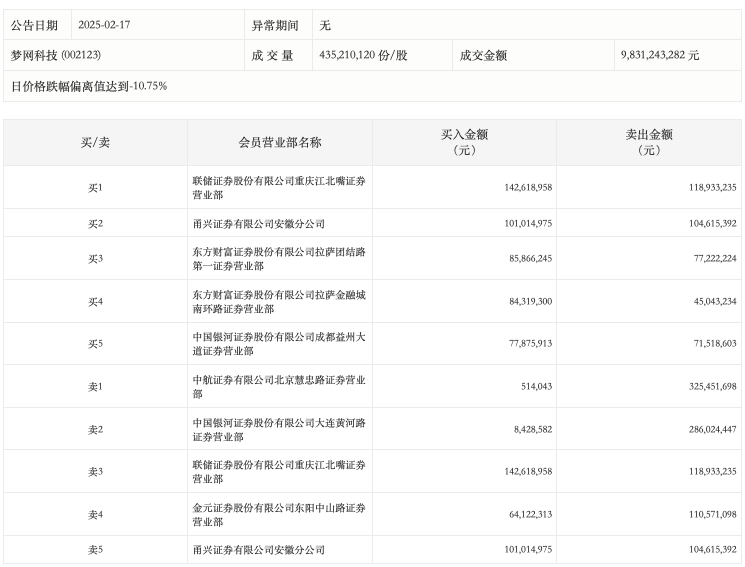 2月17日,梦网科技今日跌停,全天换手率达60.85%,振幅达20.04%。龙虎榜数据显示,营业部席位合计净卖出5.75亿元。其中,中航证券有限公司北京慧忠路证券营业部、中国银河证券大连黄河路证券营业部分别卖出3.25亿元、2.86亿元;联储证券重庆江北嘴证券营业部、甬兴证券有限公司安徽分公司分别买入1.43亿元、1.01亿元。