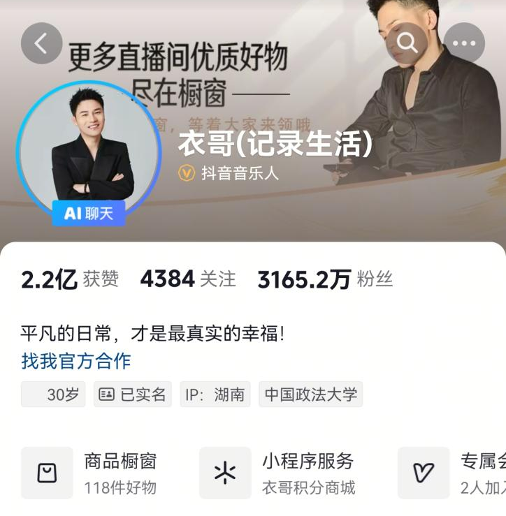 公开资料显示,衣哥原名黄华,1990年出生于湖南省株洲市,是一位抖音头部带货主播。其于2019年开始尝试制作短视频,同年因一条借车视频而走红出圈,2020年衣哥开始进行直播带货,并在次年开设了自己的MCN机构湖南衣选网络科技集团有限公司(下称:“衣选集团”)。截止发稿时,衣哥抖音粉丝数量达3165.2万人,累计获得的点赞量高达2.2亿次。