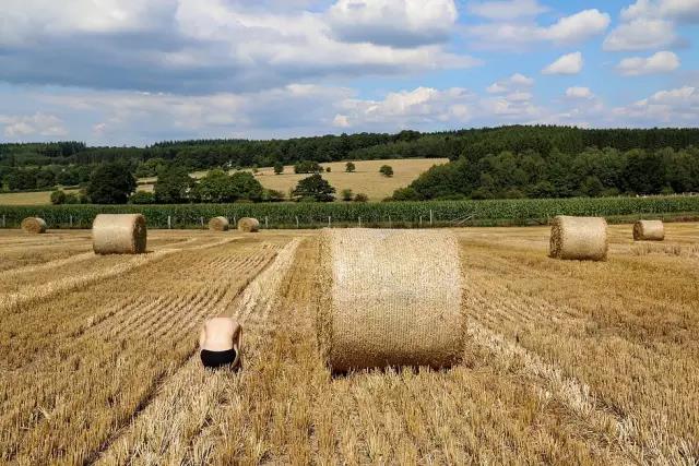 蓝天白云下,裸露的身体和大地的稻草色融为一体,找呀找呀找body。