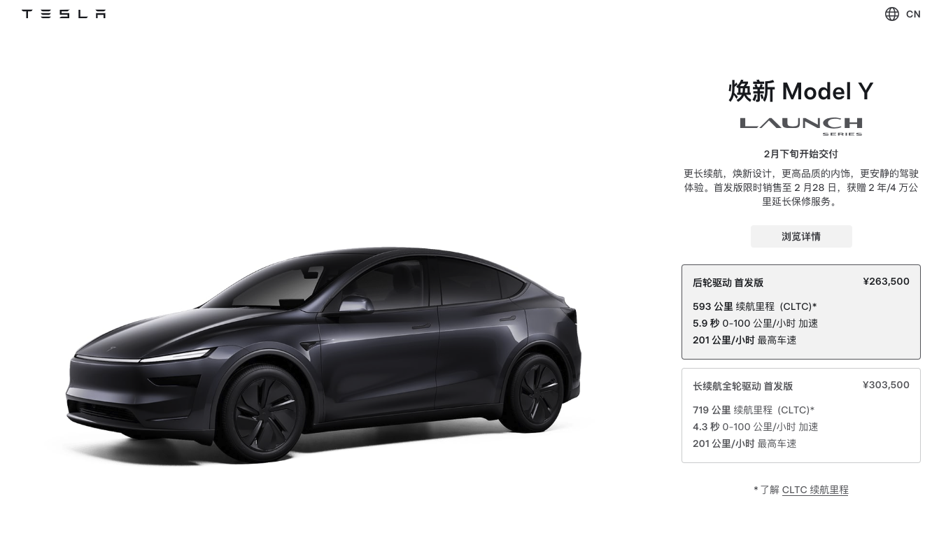 2月18日,特斯拉中国官网显示,焕新版Model Y车型的交付时间现已更新,该车将于2月下旬开始交付。据了解,首发版车型将限时销售至2月28日,后轮驱动版售价26.35万元,长续航全轮驱动版售价30.35万元。