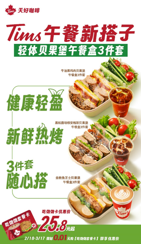 “轻体贝果堡午餐盒”系列于2月18日起在Tims天好咖啡全国门店上市,内含三件套:新鲜热烤的贝果堡提供温暖饱腹感,时蔬沙拉注入清新活力,搭配健康饮品,确保膳食的营养和均衡。此次午餐盒系列提供8种贝果堡、5种小食和11种饮品选择,可根据个人口味随心搭配,自由组合,更好地满足顾客对口味和营养的个性化需求;叠加“吃饱饱卡”6折优惠,午餐盒最低25.8元起,兼具高性价比与高营养价值。无论是打工人午休时的健康一餐,还是健身之后的能量补充,亦或是亲朋好友聚会时的美味分享,午餐盒都能为每位顾客带来惊喜。