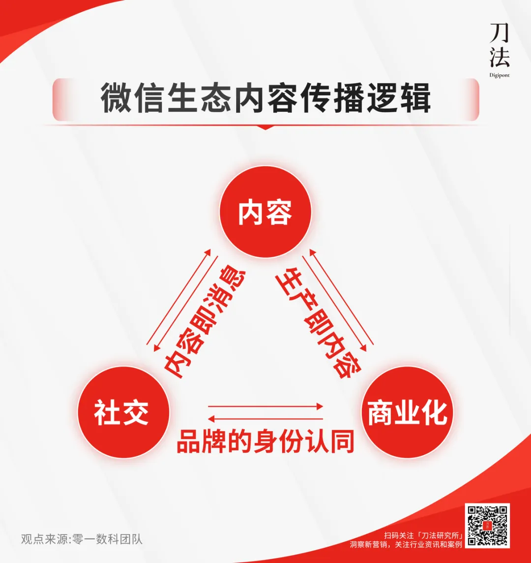 在零一数科的微信生态内容传播逻辑图中,微信存在着“内容-社交-商业化”的三角循环。在鉴锋看来,去年年底推出的送礼“小蓝包”功能就属于内容部分。