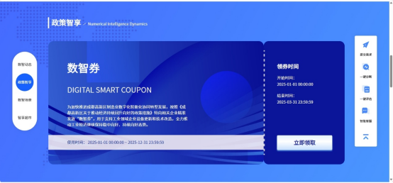 登录成都高新区制造业智改数转公共服务平台(https://www.cdhtitrans.cn),选择需要领取的数智券,点击“立即领取”按钮。