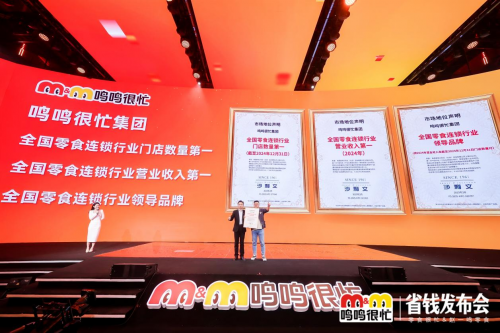 据了解,鸣鸣很忙2024年零售额突破555亿元,在营门店数超过15000家。基于这一强大数据,国际权威咨询机构弗若斯特沙利文(Frost & Sullivan)大中华区合伙人兼董事总经理张葛建登台为鸣鸣很忙颁发“全国零食连锁行业领导品牌”、“全国零食连锁行业门店数第一”、“全国零食连锁行业营业收入第一”等认证。他表示:“鸣鸣很忙以极致供应链整合、强大的品牌势能和高效的门店模型,在竞争激烈的量贩零食市场中建立了独特的竞争壁垒。鸣鸣很忙不仅是行业发展的风向标,更是推动零售行业效率革命的重要力量。”