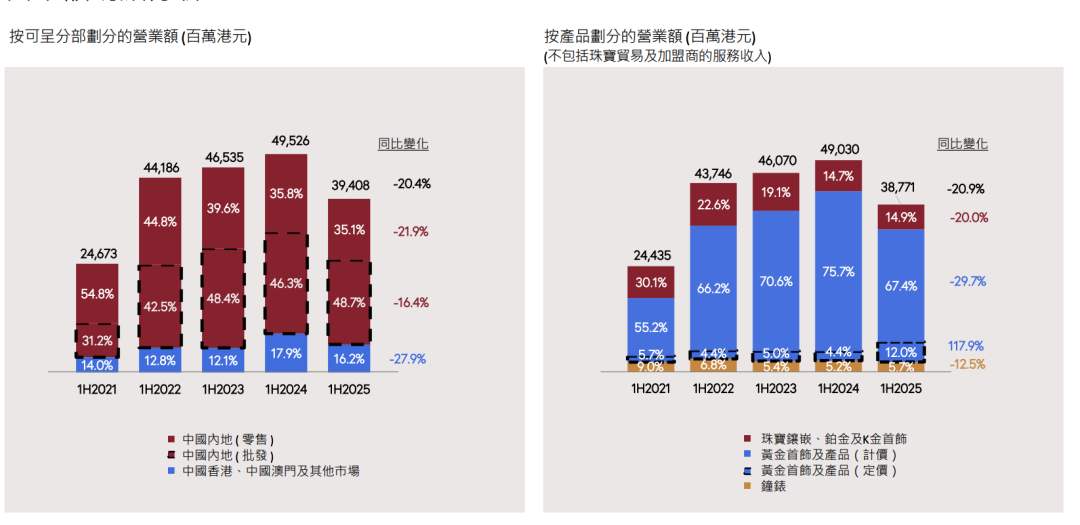 根据周大福2025财政年度上半年(截至2024年9月30日六个月)财报数据,当期周大福总营收、归母净利润同比分别下滑20%和44%。财报中指出,内地部分消费者对购买黄金首饰持观望态度,导致中国内地市场营业额同比下跌18.8%。同时中国香港、中国澳门及其他市场也因市民外游及内地旅客消费模式和喜好转变而受到影响,营业额同比下跌了27.9%。