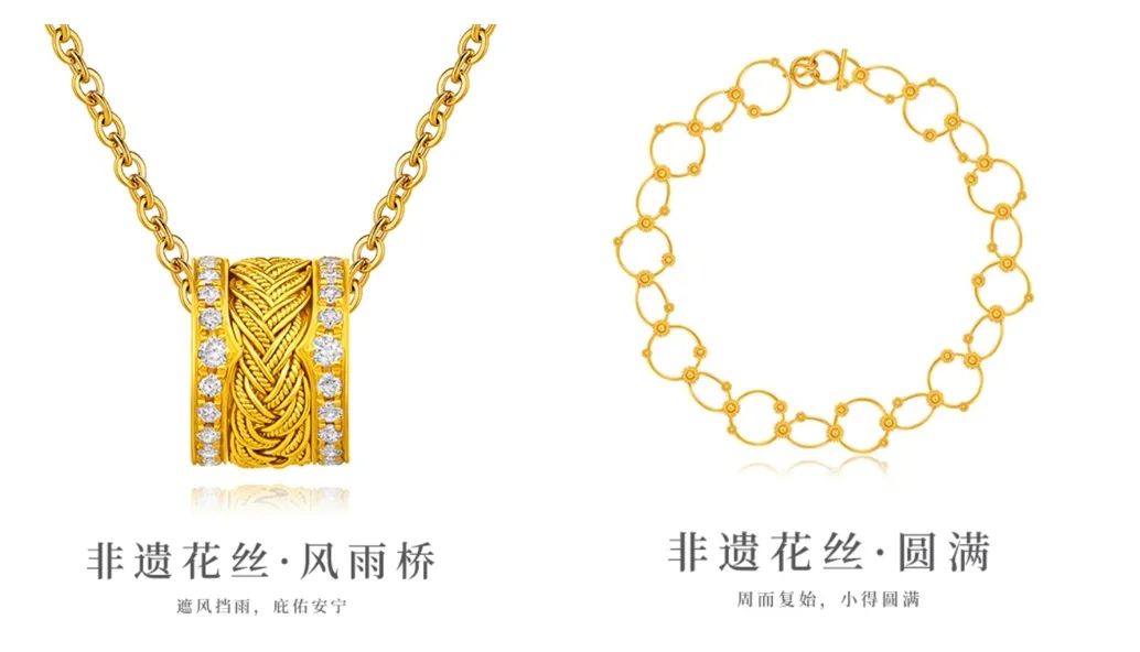 也有品牌打传统文化牌,满足年轻人追求文化自信的风潮,如潮宏基采用花丝非遗工艺的“花丝·风雨桥”系列,借鉴古代山水画风格的老凤祥“玲珑碧波”系列耳饰、“风韵秀逸”系列项链,以及周大生的“千里江山”系列圆珠套链等。