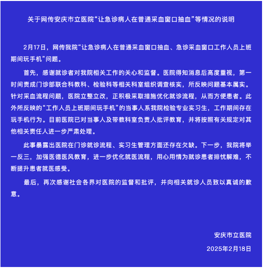 2月18日,安徽安庆市立医院发布关于网传该院“让急诊病人在普通采血窗口抽血、急诊采血窗口工作人员上班期间玩手机”等情况的说明称,经调查核实,所反映问题基本属实。针对采血流程问题,医院立整立改,正积极采取措施优化就诊流程,从而方便患者。此外所反映的“工作人员上班期间玩手机”的当事人系医院检验专业实习生,工作期间存在玩手机行为。目前医院已对当事人及带教科室负责人批评教育,并将按照有关规定对其他相关责任人进一步严肃处理。