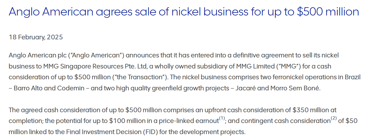 英美资源集团2月18日宣布达成最终协议,将向五矿资源全资子公司MMG Singapore Resources出售镍业务,现金对价最高为5亿美元。这笔交易预计于今年第三季度完成。