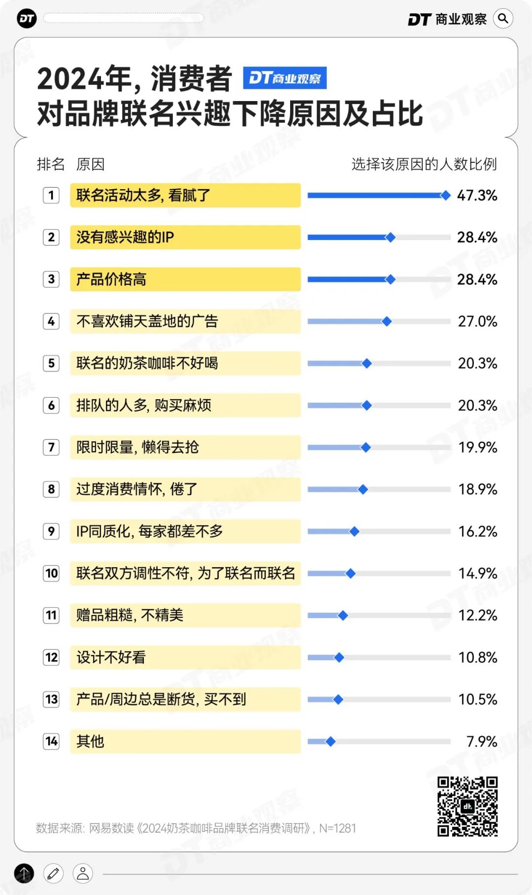 根据网易数读发起的《2024奶茶咖啡品牌联名消费调研》显示,人们对品牌联名兴趣下降的主要原因是“联名活动太多,看腻了”和“没有感兴趣的IP”,两者的比例分别占据了47.3%和28.4%。
