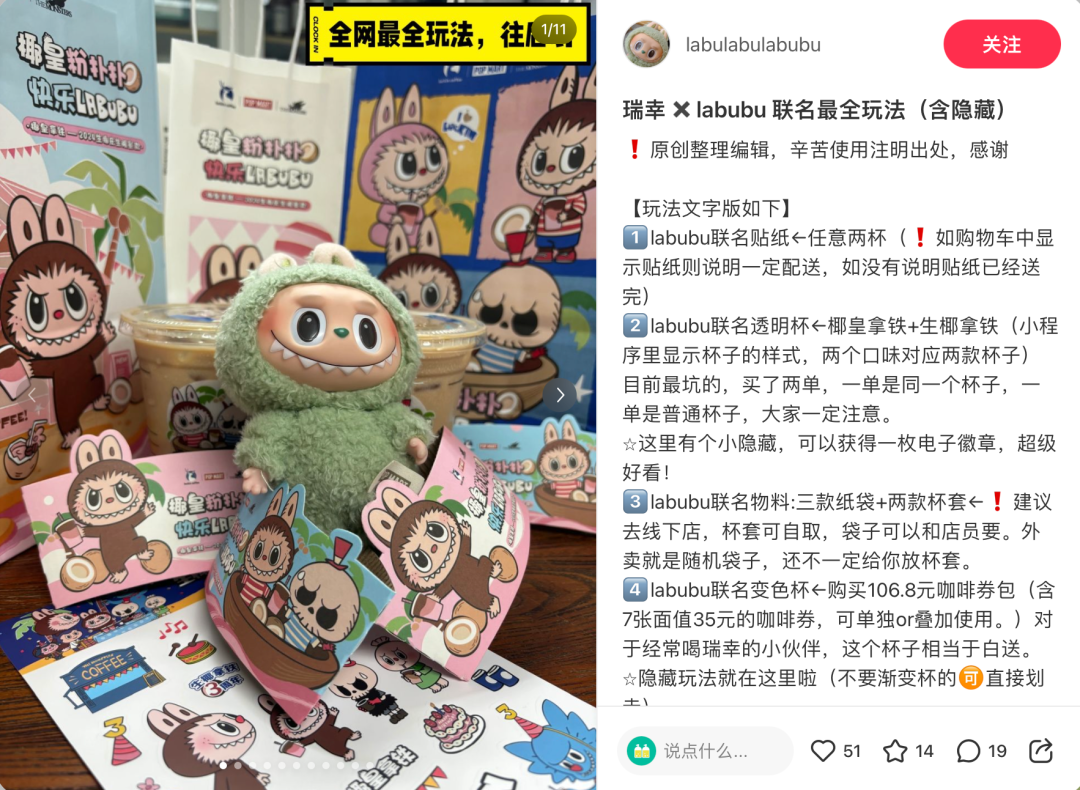 从2023年冰吸生椰拿铁联名哆啦A梦、展现产品配方的清凉因子;到2024年椰皇拿铁合作潮玩LABUBU、传递“冰爽升级”的卖点,瑞幸生椰靠不同IP的联名创意,驱动粉丝下单并拉高产品热度。生椰系列也由此深入消费心智,成为不可替代的瑞幸大单品。