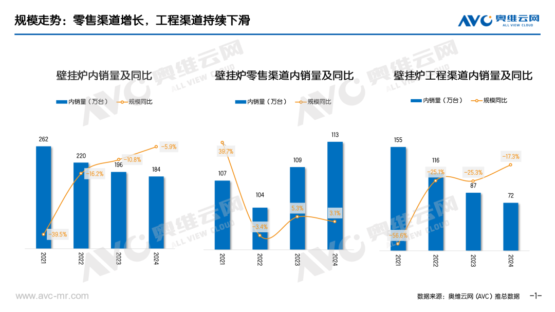 在当前宏观经济形势下,2024年中国壁挂炉行业规模数据反映出行业发展的压力。奥维云网(AVC)推总数据显示,2024年中国壁挂炉内销量为184万台,同比下降5.9%,零售渠道内销量113万台,同比增长3.1%,工程渠道内销量72万台,同比下滑17.3%。