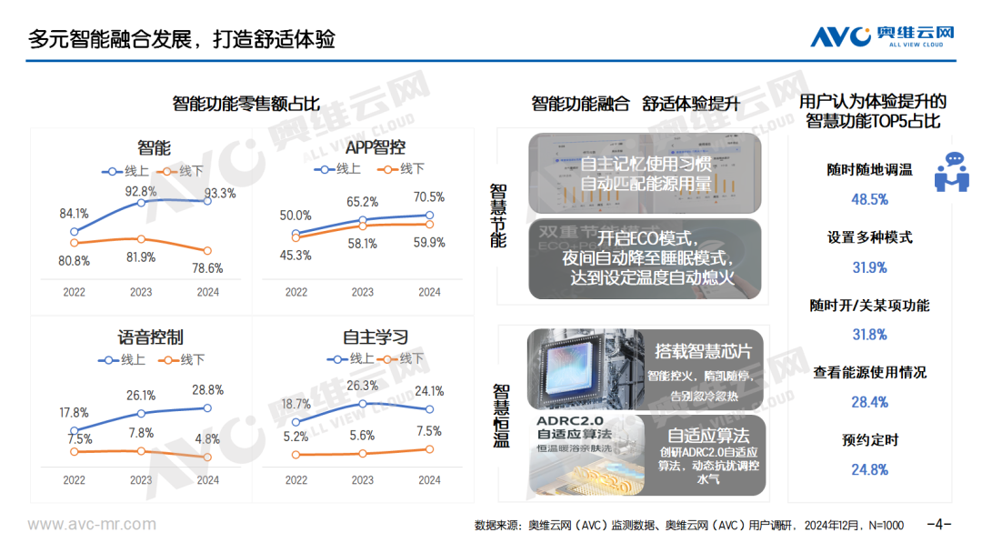 进一步细分智能产品类型,奥维云网(AVC)监测数据显示,2024年APP控制产品线上零售额占比为70.5%,同比增长5.3%,线下零售额占比为 59.9%,同比增长1.8%;语音控制线上零售额占比为28.8%,同比增长 2.7%,线下零售额占比为4.8%,同比下滑2.9%。APP控制产品无论是线上还是线下都保持着增长趋势,线上增长更为明显;而语音控制产品在线上呈现良好势态。