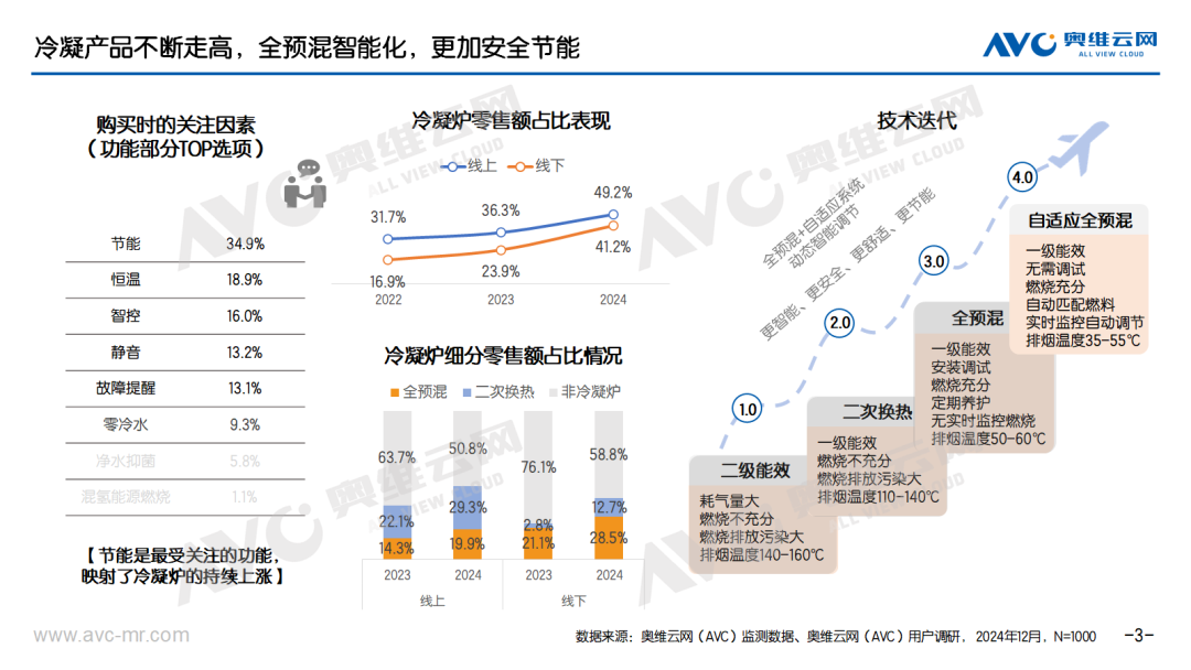 冷凝式壁挂炉,作为壁挂炉领域的技术革新代表,以高效节能的卓越性能在市场中崭露头角。奥维云网(AVC)监测数据显示,2024年冷凝壁挂炉线上零售额占比49.2%,线下零售额占比41.2%,呈逐年上升趋势。这种增长主要得益于消费者环保意识的提升和对节能产品的青睐,同时国家政策也起到了积极的推动作用。可以预见,在未来壁挂炉市场,冷凝炉将凭借其节能优势,占据更为重要的地位,引领行业朝着绿色、高效的方向发展。