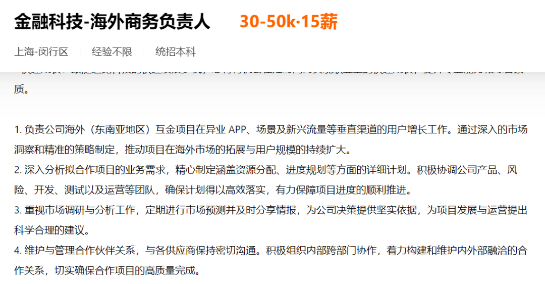 比如,在招聘网站上,追觅正在招聘“金融科技-商务负责人”,月薪在30-50K之间,其岗位职责主要包括“负责变现业务机构接入、流量获客等商务谈判及后期合作,对结果负责”等。