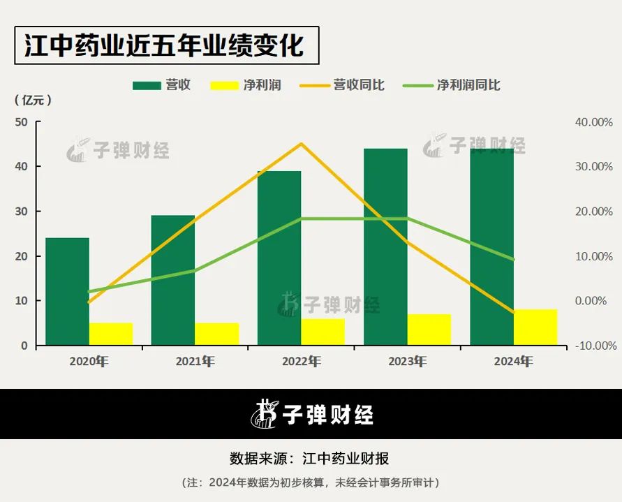 近五年,江中药业营收已由2020年的24亿元增长至2024年的44亿元,同期归母净利润也由5亿元增长至8亿元。