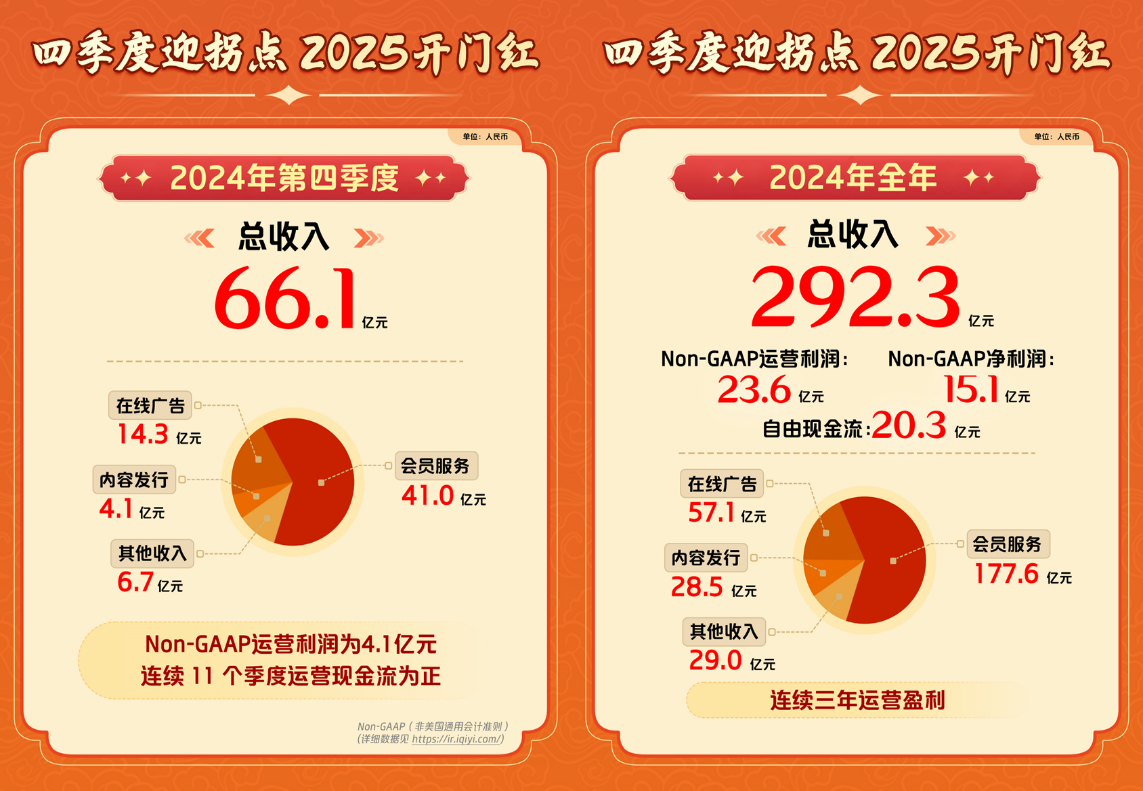 2月18日,爱奇艺(NASDAQ:IQ)发布截至2024年12月31日未经审计的第四季度及全年财报。全年收入292.3亿元人民币,Non-GAAP(非美国通用会计准则)运营利润23.6亿元,Non-GAAP运营利润率8%,连续三年实现运营盈利。其中,第四季度,爱奇艺总收入66.1亿元,Non-GAAP运营利润为4.1亿元,Non-GAAP运营利润率6%。