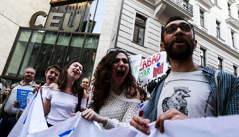 周日,匈牙利布达佩斯数万民众走上街头抗议,反对一项将迫使中欧大学(Central European University)关闭的新立法。
