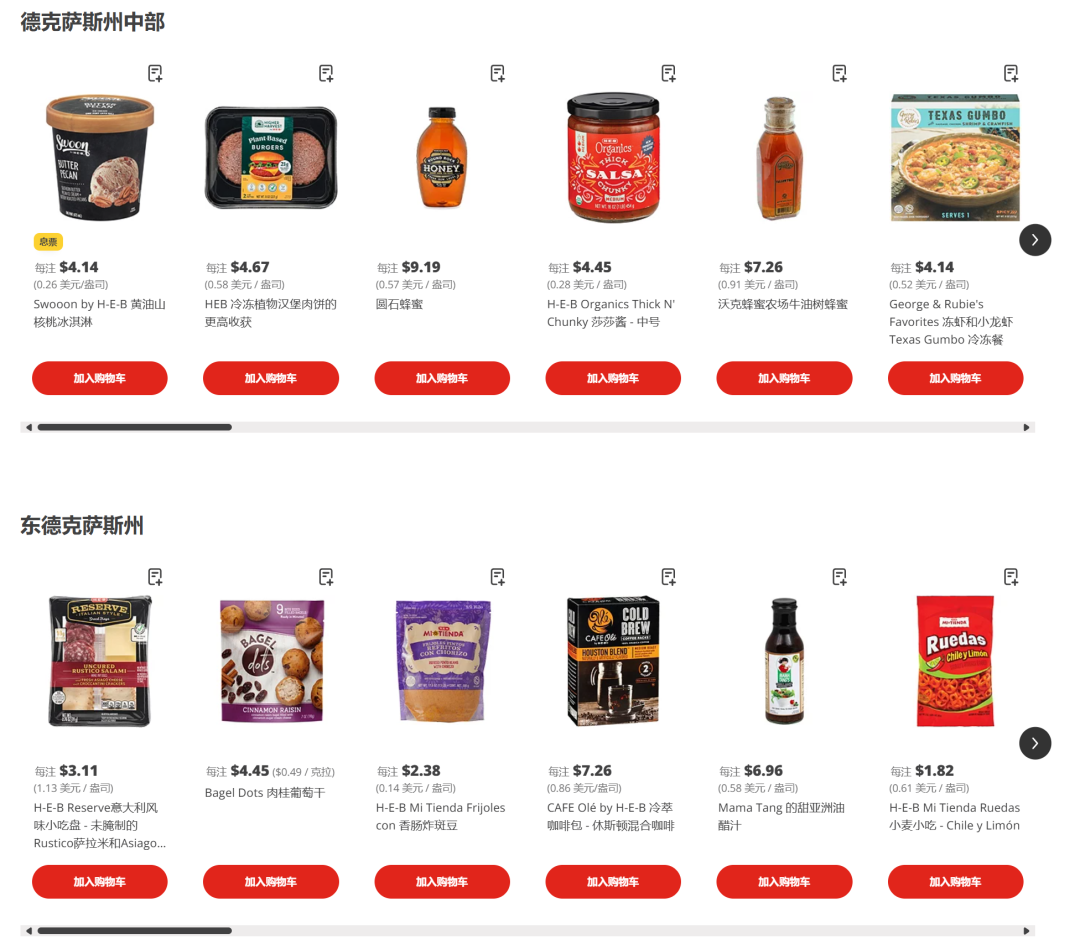 不仅如此,H-E-B还通过自有在线商城,详细展示来自德克萨斯州各地的特色产品,让消费者根据自己的地区偏好轻松选购。