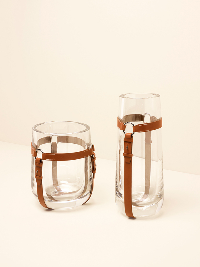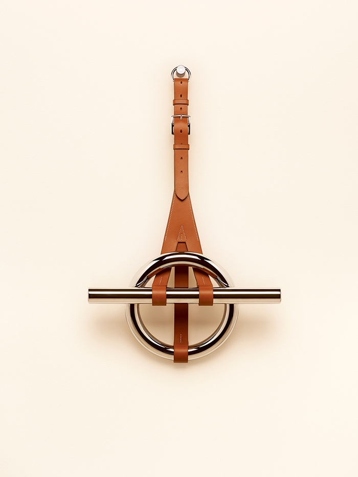 在这一组设计中,不仅有由Studio Hermes与设计师合作的、灵感来自马具的挂架,也实验性地在玻璃杯、金属挂钩、木质托盘等多种材质的家居上加入皮革素材,让日常的家居品也具有绅士般的高级感。