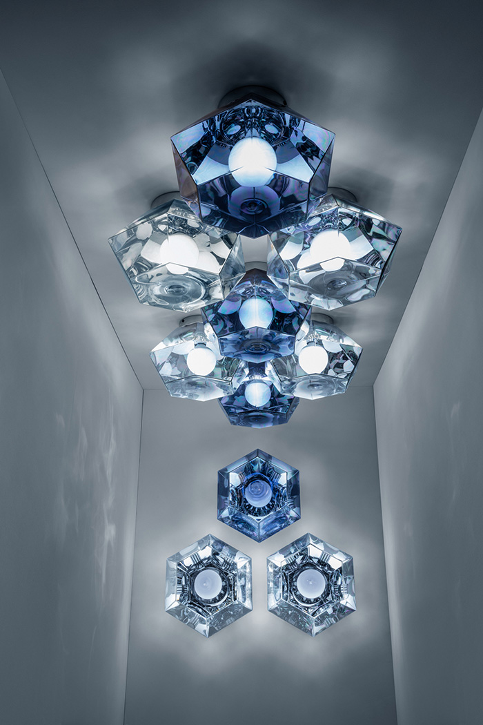 这套名为 Cut 的全新系列钻石型吊灯,当灯光开启时,犹如镜面般的抛光面被投映出出无数灯泡影像,像一个万花筒般具有强烈的视觉冲击。