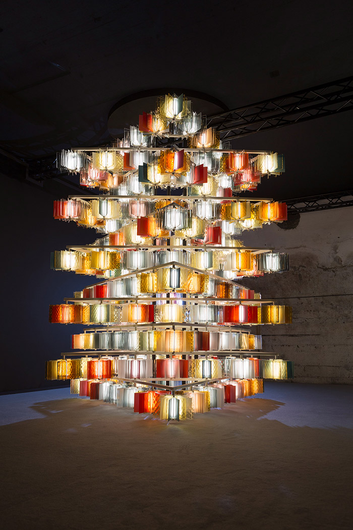 Salviati另一件惊艳的作品由艺术家 Ben Gorham 带来,他将无数片状玻璃组装成旋转木马的形状,然后组合出一架树状的悬挂照明装置。这些代表着不同颜色、工艺的灯具在一起算发出的壮观的温暖光芒。