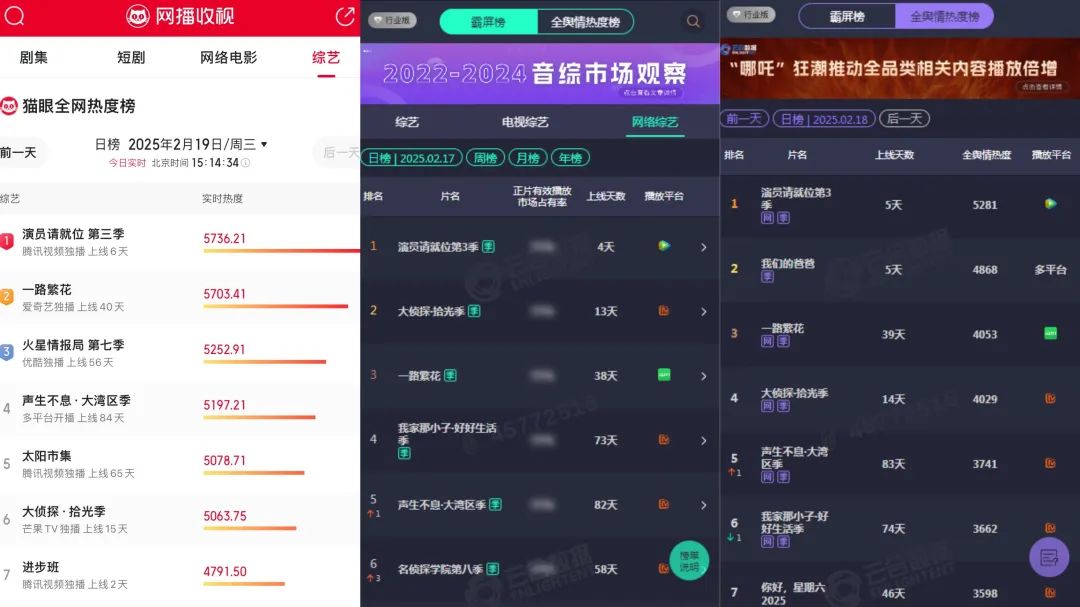 优酷《盒子里的猫2》也在此期间发布了预告,而按照爱奇艺早前发布的2月剧综片单,《种地吧3》预计同样是回归在即,再加上在播的《大侦探·拾光季》《斗笑社第三季》以及已定档的《妻子的浪漫旅行2025》,一场由平台王牌综N代领衔的大型生存赛已弥漫着刺鼻的硝烟味。
