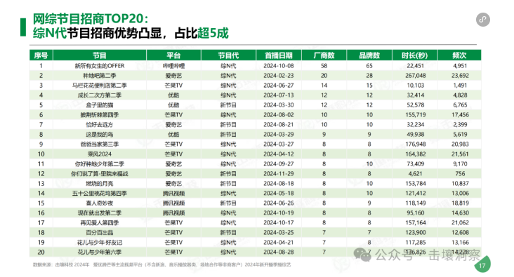 与之呼应,击壤洞察《2024年综艺植入白皮书》显示,在网络综艺招商TOP20中综N代的招商优势显著,占比超五成,B站《新所有女生的OFFER》、爱奇艺《种地吧2》、芒果TV《马栏花花便利店第二季》分别拿下前三甲。