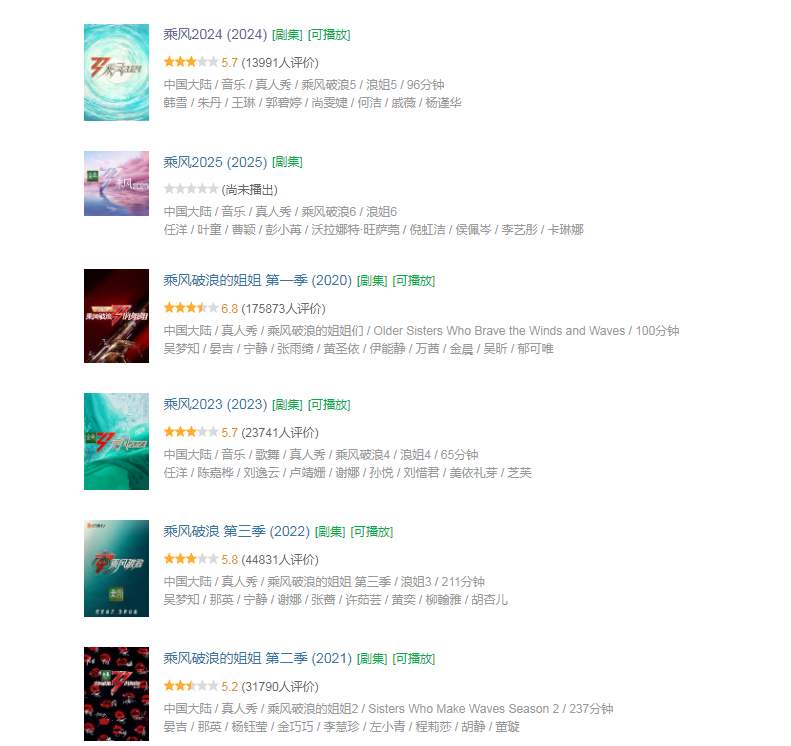 与《演员请就位》系列不相上下甚至尤有胜之,《浪姐》系列的每一季都能产出铺天盖地的话题,但在如何制造出圈舞台承接流量上却总是不得其解,这一点自第二季开始一直处于及格线之下的豆瓣口碑,就是最好的证明。